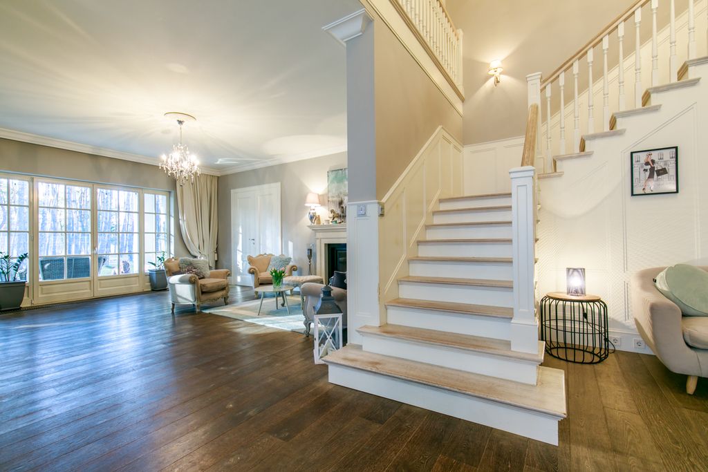 Parter połączony z piętrem reprezentacyjnymi schodami w przestronnym hallu z antresolą.