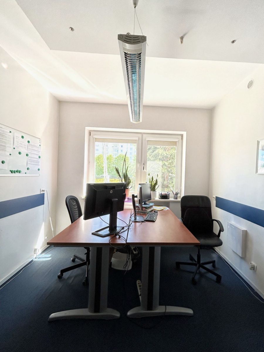 Przestrzeń mieści się w niewielkim, spokojnym obiekcie otoczonym zielenią, co gwarantuje komfortowe warunki pracy i możliwość relaksu w ogrodzie