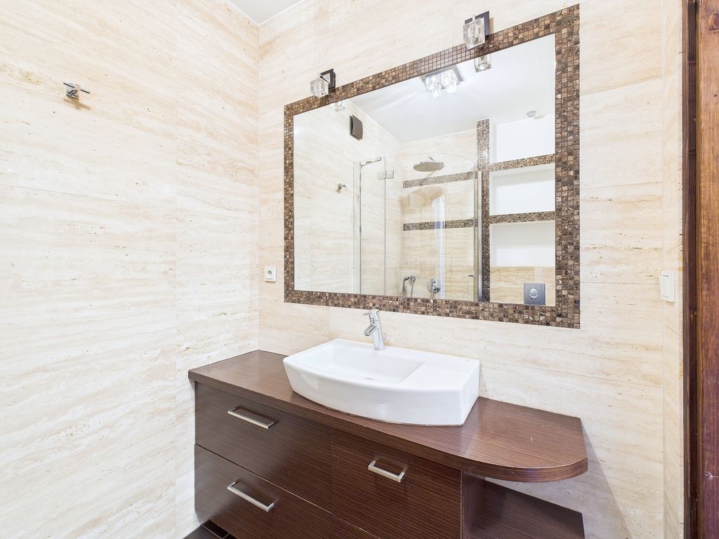 - Łazienka: 3,78 m² – z ogrzewaniem podłogowym, włoski trawertyn, gres, armatura Grohe i Roca,