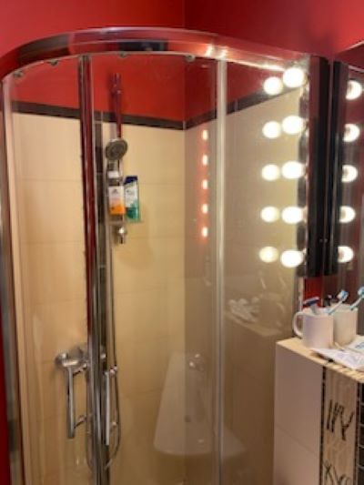 W przedpokoju szafy wnękowe: jedna na okrycia wierzchnie, druga jako szafka gospodarcza (mieści odkurzacz, deskę do prasowanie, mopy, wiaderka itp). W łazience kabina prysznicowa, duża umywalka , sedes i pralka.