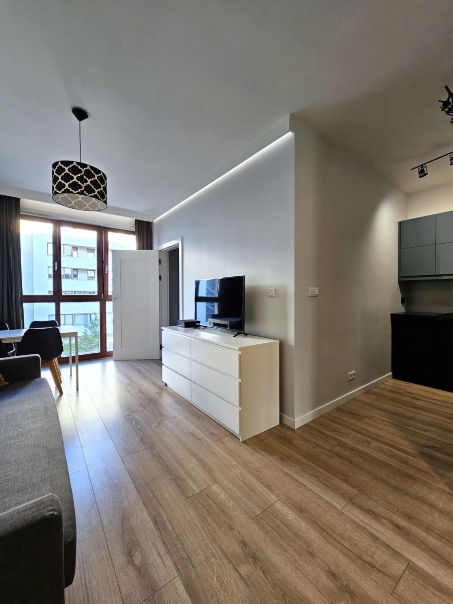Mieszkanie na monitorowanym osiedlu Mozaika Mokotów wybudowanym przez Layetana Real Estate przy Cybernetyki 7. Jest widne, z dużymi drewnianymi oknami od pd-wsch, bez balkonu. Składa się z dwóch pokoi, aneksu kuchennego i łazienki. Mieszkanie jest obecnie wynajęte z umową do stycznia 2026 roku. Cena zawiera wyposażenie widoczne na zdjęciach.