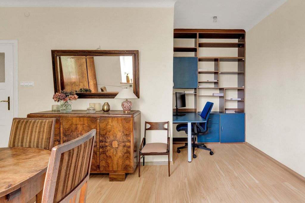 The apartment requires renovation, and its layout allows for the creation of an additional room. The alcove in the living room, currently used as a workspace, can be converted into a kitchenette. The existing separate kitchen could then be adapted into a bedroom. This layout works well both for owner-occupation and as a rental investment.