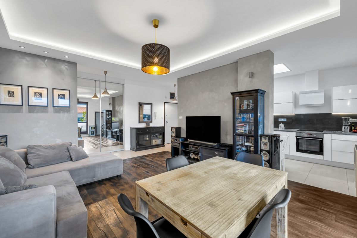 • Układ: 4 pokoje, w tym przestronny salon połączony z kuchnią,