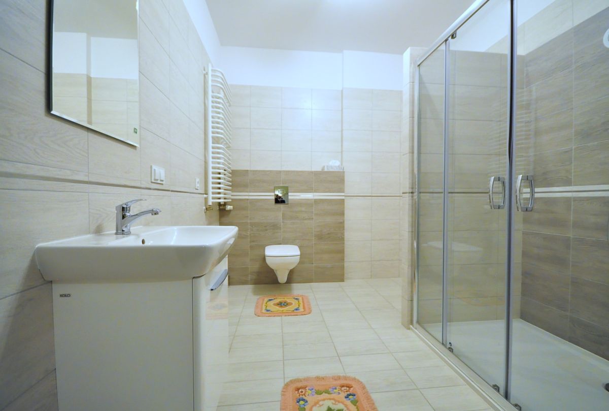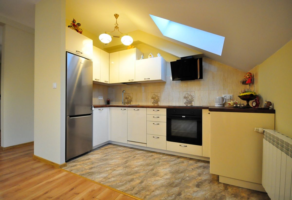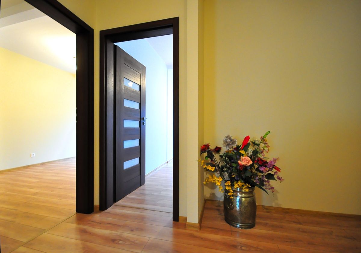 Mieszkanie rozkładowe: dwie sypialnie, przestronny salon z aneksem kuchennym, duża łazienka.